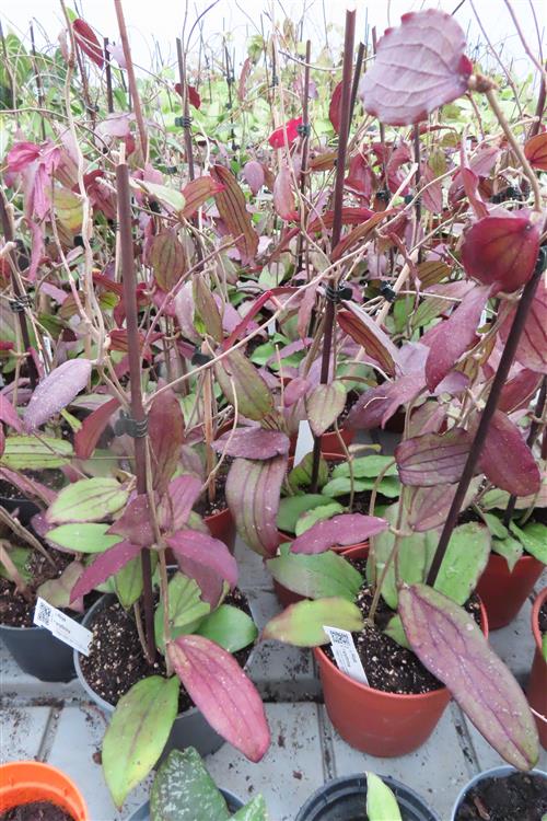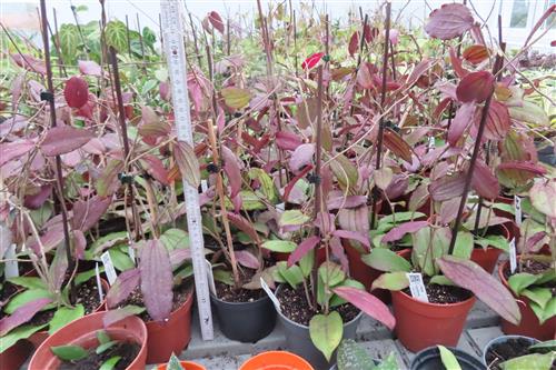 Blüte : gelblich. Die Hoya erythrina, auch bekannt als Wachsblume, ist eine exotische Schlingpflanze, die in Vietnam, Thailand und Malaysia beheimatet ist. Sie ist bei Pflanzenliebhabern aufgrund ihrer schönen, geäderten Blätter, die sich bei viel Licht rötlich verfärben, und ihrer duftenden Blüten beliebt. Die Pflanze eignet sich gut für Ampeln oder als Kletterpflanze an einer Stütze.