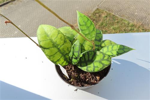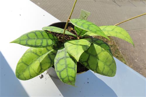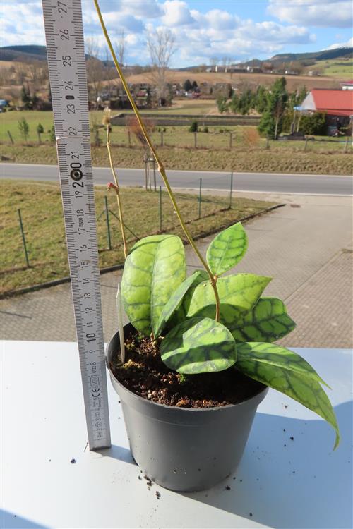 Die Hoya callistophylla Black Cat ist eine außergewöhnliche, epiphytisch wachsende Wachsblume, die sich durch ihre intensiv geäderten Blätter auszeichnet. Sie wird von Sammlern wegen ihrer beeindruckenden Blattzeichnung und der duftenden Blüten geschätzt.