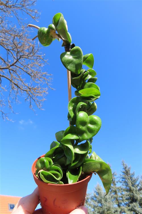 Die Hoya carnosa compacta Krinkle (Krinkle Kurls) ist pflegeleicht: Sorge für helles, indirektes Licht, gieße nur sparsam, wenn die Erde trocken ist, vermeide Staunässe, und dünge während der Wachstumszeit leicht. Halte Temperaturen zwischen 18-24°C und gib der Pflanze nach der Blüte keine Ruhepause, da sie sonst die Knospen abwerfen kann.