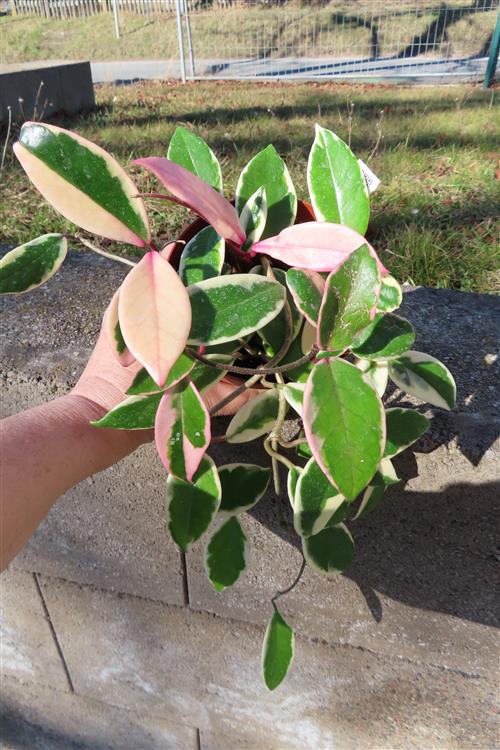 Die Hoya carnosa Flamingo Dream, auch als Wachsblume oder Porzellanblume bekannt, ist eine kletternde Zimmerpflanze, die für ihre attraktiven, panaschierten Blätter mit rosa gefärbten Trieben geschätzt wird.