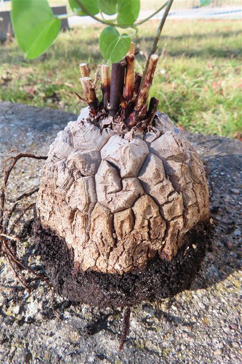 Die Pflanze Dioscorea elephantipes, auch Schildkrötenpflanze genannt, ist eine sukkulente Caudexpflanze aus Südafrika. Sie ist für ihre auffällige, holzige Knolle (Caudex) bekannt, die bei älteren Exemplaren an den Panzer einer Schildkröte erinnert. Als Zimmerpflanze ist sie aufgrund ihres einzigartigen Aussehens und ihrer Anspruchslosigkeit bei Sammlern sehr beliebt.