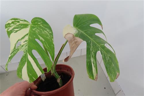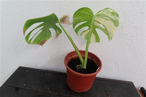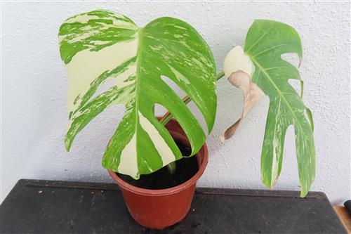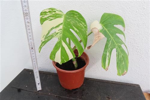 Die Monstera Deliciosa Variegata ist eine begehrte Zimmerpflanze, die sich durch ihre einzigartige, panaschierte (gescheckte) Blattfärbung in Weiß und Grün auszeichnet. Die Musterung ist das Ergebnis einer genetischen Mutation und bei jedem Blatt anders, was die Pflanze zu einem begehrten Sammlerstück macht.