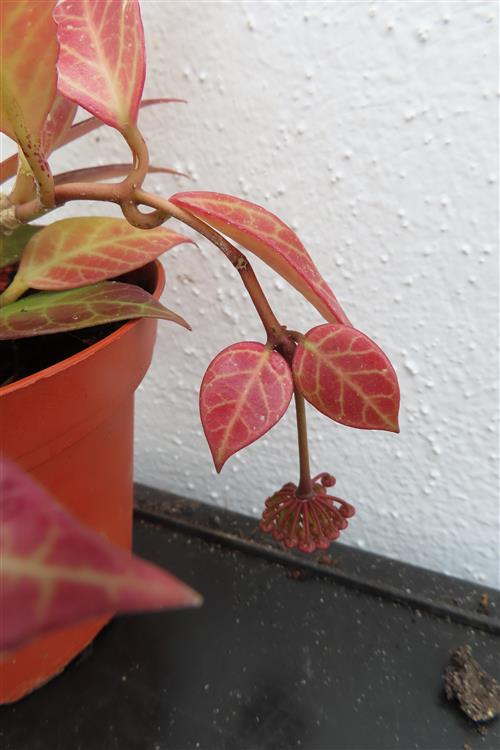 Die Hoya Sunrise ist eine Porzellanblume, die aus einer Kreuzung von Hoya lacunosa und Hoya obscura entstanden ist. Die Hybride ist für ihre einzigartige Blätterfärbung bekannt, bei der die grünen Blätter unter starkem, indirektem Licht rötliche bis bordeauxfarbene Töne annehmen. Neben ihrem attraktiven Laub begeistert sie mit zarten, süßlich duftenden Blüten.