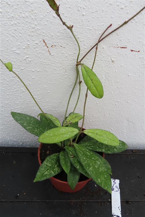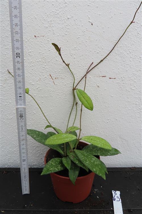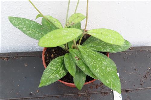 Die Hoya crassipetiolata Splash ist eine seltene und beeindruckende Hoya-Sorte, die für ihre dicken, glänzenden Blätter mit einzigartiger silberner Sprenkelung bekannt ist. Die Pflanze ist relativ pflegeleicht und für Hängekörbe oder Rankhilfen geeignet.