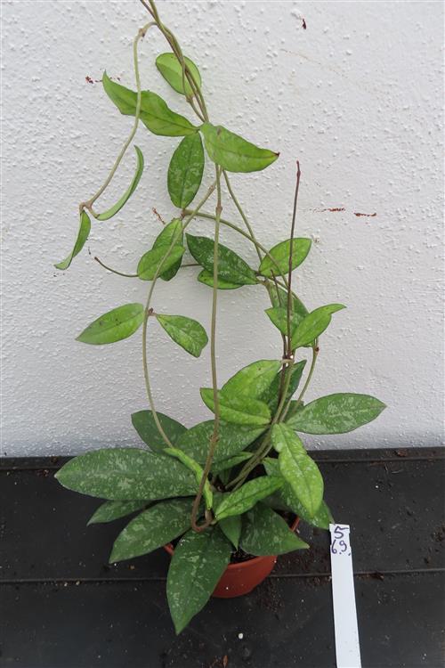 Die Hoya crassipetiolata Splash ist eine seltene und beeindruckende Hoya-Sorte, die für ihre dicken, glänzenden Blätter mit einzigartiger silberner Sprenkelung bekannt ist. Die Pflanze ist relativ pflegeleicht und für Hängekörbe oder Rankhilfen geeignet.