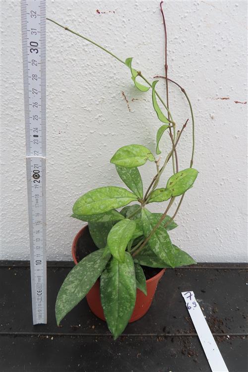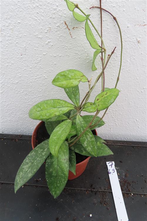 Die Hoya crassipetiolata Splash ist eine seltene und beeindruckende Hoya-Sorte, die für ihre dicken, glänzenden Blätter mit einzigartiger silberner Sprenkelung bekannt ist. Die Pflanze ist relativ pflegeleicht und für Hängekörbe oder Rankhilfen geeignet.