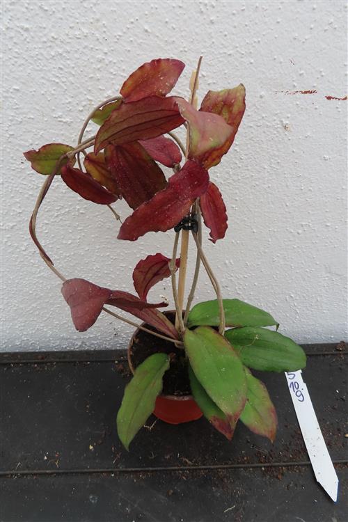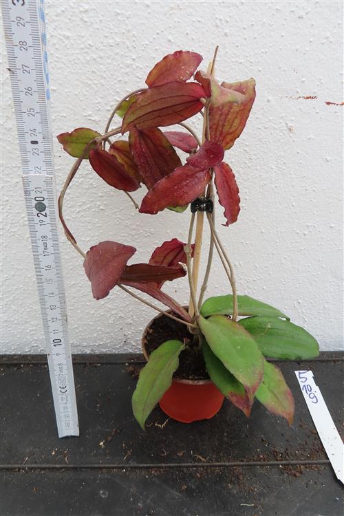 Blüte : gelblich. Die Hoya erythrina, auch bekannt als Wachsblume, ist eine exotische Schlingpflanze, die in Vietnam, Thailand und Malaysia beheimatet ist. Sie ist bei Pflanzenliebhabern aufgrund ihrer schönen, geäderten Blätter, die sich bei viel Licht rötlich verfärben, und ihrer duftenden Blüten beliebt. Die Pflanze eignet sich gut für Ampeln oder als Kletterpflanze an einer Stütze.