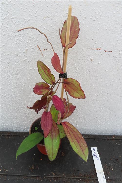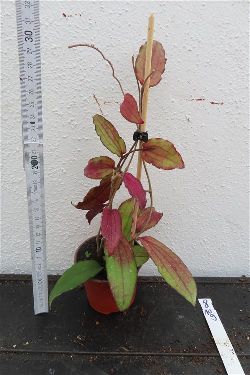 Blüte : gelblich. Die Hoya erythrina, auch bekannt als Wachsblume, ist eine exotische Schlingpflanze, die in Vietnam, Thailand und Malaysia beheimatet ist. Sie ist bei Pflanzenliebhabern aufgrund ihrer schönen, geäderten Blätter, die sich bei viel Licht rötlich verfärben, und ihrer duftenden Blüten beliebt. Die Pflanze eignet sich gut für Ampeln oder als Kletterpflanze an einer Stütze.