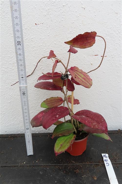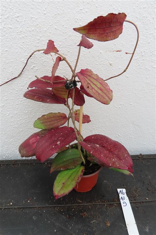Blüte : gelblich. Die Hoya erythrina, auch bekannt als Wachsblume, ist eine exotische Schlingpflanze, die in Vietnam, Thailand und Malaysia beheimatet ist. Sie ist bei Pflanzenliebhabern aufgrund ihrer schönen, geäderten Blätter, die sich bei viel Licht rötlich verfärben, und ihrer duftenden Blüten beliebt. Die Pflanze eignet sich gut für Ampeln oder als Kletterpflanze an einer Stütze.