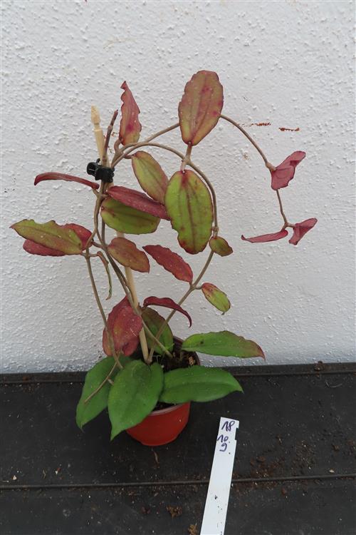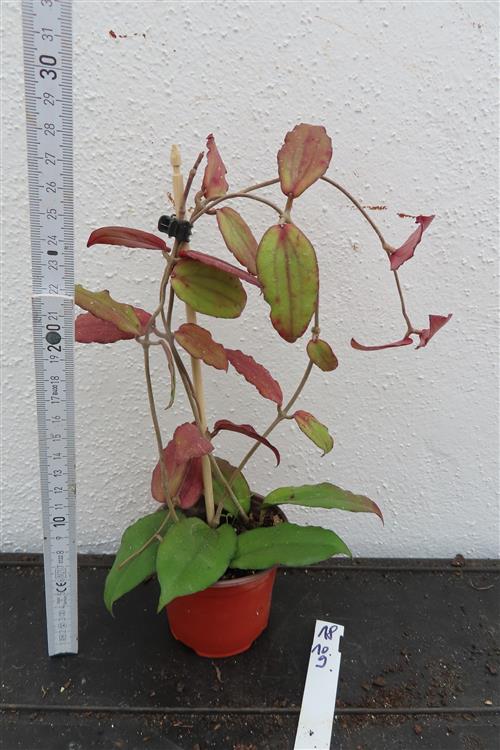 Blüte : gelblich. Die Hoya erythrina, auch bekannt als Wachsblume, ist eine exotische Schlingpflanze, die in Vietnam, Thailand und Malaysia beheimatet ist. Sie ist bei Pflanzenliebhabern aufgrund ihrer schönen, geäderten Blätter, die sich bei viel Licht rötlich verfärben, und ihrer duftenden Blüten beliebt. Die Pflanze eignet sich gut für Ampeln oder als Kletterpflanze an einer Stütze.
