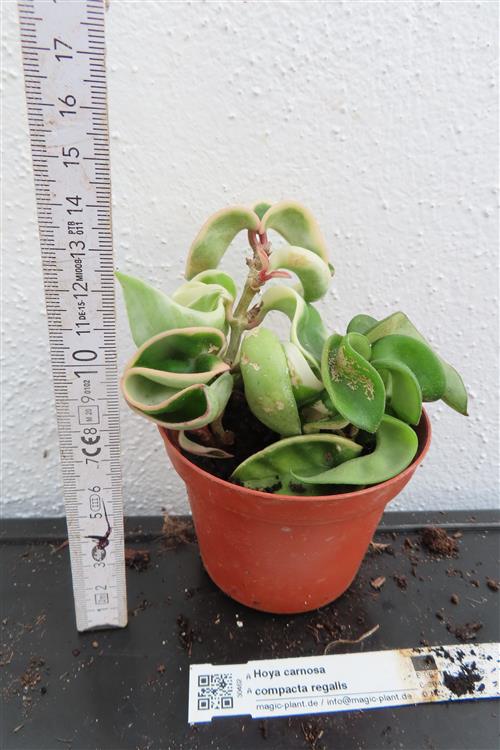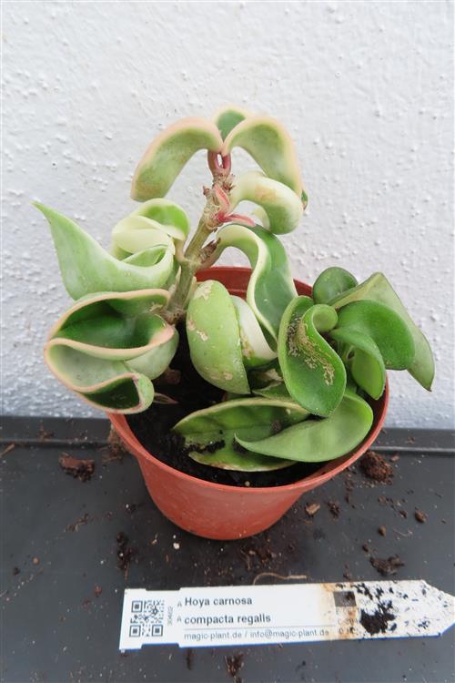 Die Hoya carnosa compacta regalis hat grün-weis gescheckte Blätter. Sie liebt einen hellen Standort ohne direkte Mittagssonne und eine dedizierte Bewässerung nur, wenn die Erde trocken ist, um Wurzelfäule zu vermeiden. Im Winter ist eine kühle Ruhephase wichtig, während im Frühling und Sommer ein schwacher, stickstoffarmer Dünger und eine hohe Luftfeuchtigkeit förderlich sind. Verwenden Sie ein luftiges, gut durchlässiges Substrat, um Staunässe zu verhindern.