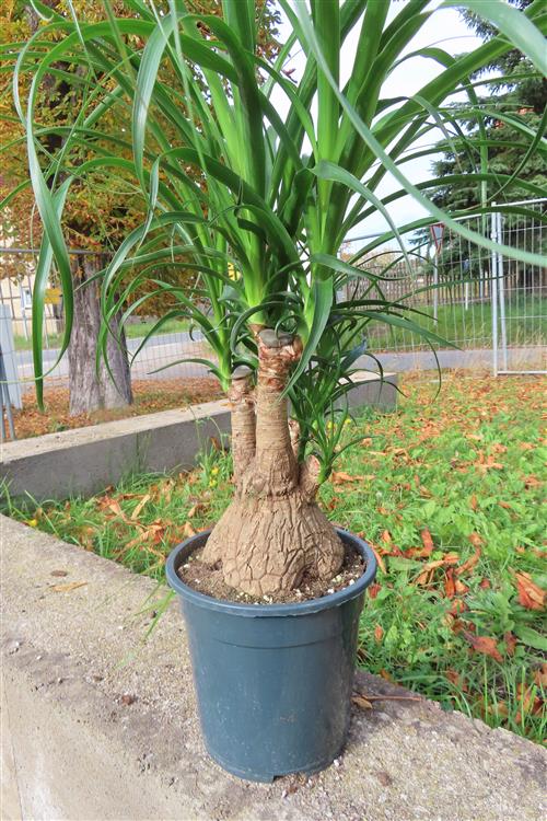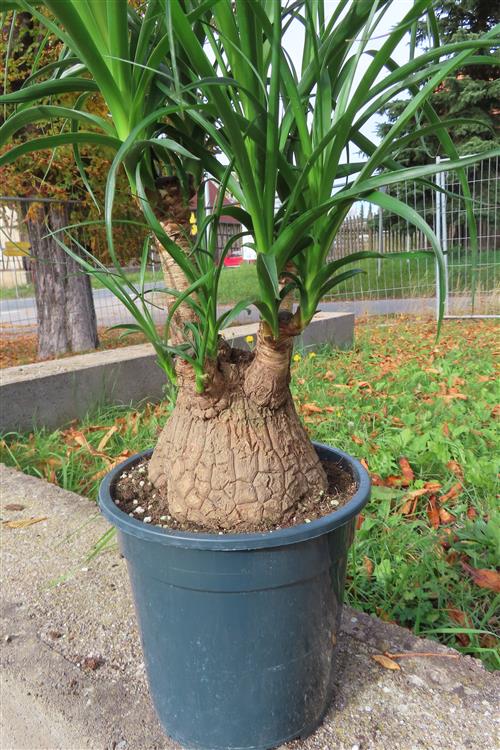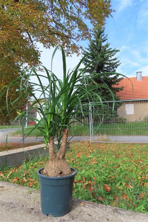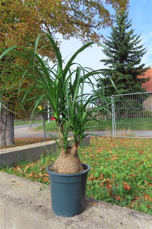 Die Pflege von Beaucarnea recurvata (Elefantenfuß) ist einfach: Stellen Sie die Pflanze an einen hellen Standort mit gefiltertem, nicht direktem Sonnenlicht und gießen Sie sie nur, wenn der Wurzelballen trocken ist, da sie Wasser im Stamm speichert und empfindlich auf Staunässe reagiert. Die Erde sollte locker und gut durchlässig sein, beispielsweise Kakteen- oder Palmenerde. Düngen Sie nur einmal im Frühling und einmal im Sommer mit Kakteendünger und topfen Sie die Pflanze nur alle drei bis fünf Jahre um.