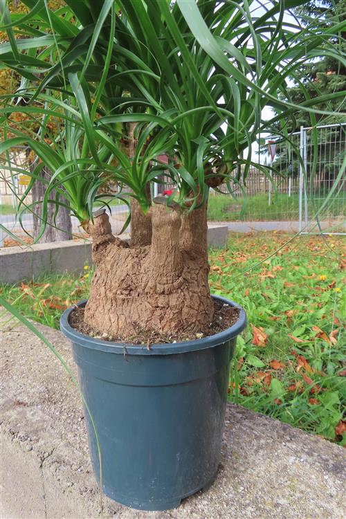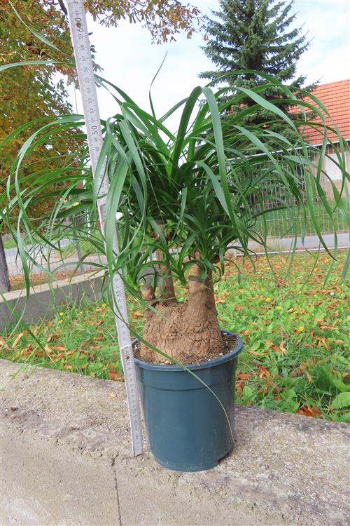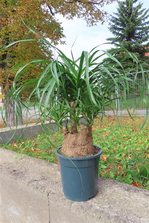Die Pflege von Beaucarnea recurvata (Elefantenfuß) ist einfach: Stellen Sie die Pflanze an einen hellen Standort mit gefiltertem, nicht direktem Sonnenlicht und gießen Sie sie nur, wenn der Wurzelballen trocken ist, da sie Wasser im Stamm speichert und empfindlich auf Staunässe reagiert. Die Erde sollte locker und gut durchlässig sein, beispielsweise Kakteen- oder Palmenerde. Düngen Sie nur einmal im Frühling und einmal im Sommer mit Kakteendünger und topfen Sie die Pflanze nur alle drei bis fünf Jahre um.