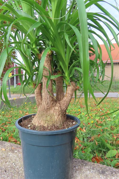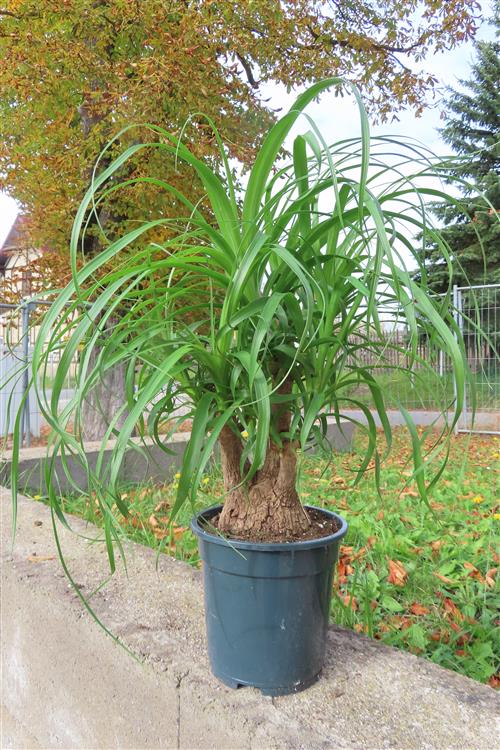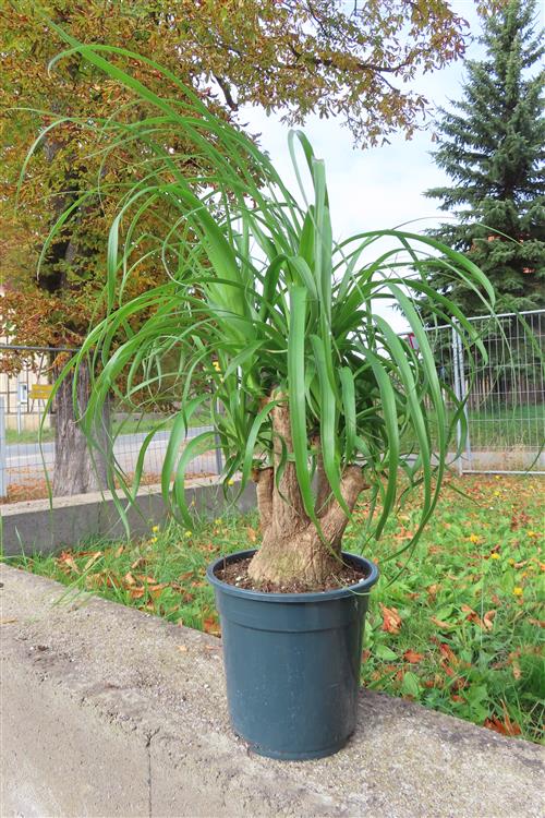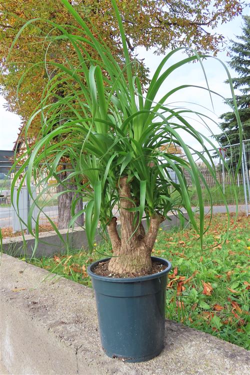 Die Pflege von Beaucarnea recurvata (Elefantenfuß) ist einfach: Stellen Sie die Pflanze an einen hellen Standort mit gefiltertem, nicht direktem Sonnenlicht und gießen Sie sie nur, wenn der Wurzelballen trocken ist, da sie Wasser im Stamm speichert und empfindlich auf Staunässe reagiert. Die Erde sollte locker und gut durchlässig sein, beispielsweise Kakteen- oder Palmenerde. Düngen Sie nur einmal im Frühling und einmal im Sommer mit Kakteendünger und topfen Sie die Pflanze nur alle drei bis fünf Jahre um.