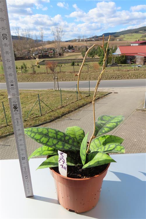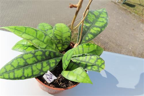 Die Hoya callistophylla Black Cat ist eine außergewöhnliche, epiphytisch wachsende Wachsblume, die sich durch ihre intensiv geäderten Blätter auszeichnet. Sie wird von Sammlern wegen ihrer beeindruckenden Blattzeichnung und der duftenden Blüten geschätzt.