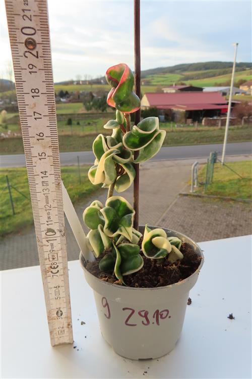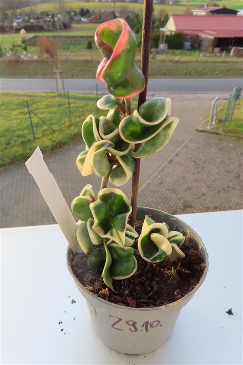 Die Hoya carnosa compacta regalis hat grün-weis gescheckte Blätter. Sie liebt einen hellen Standort ohne direkte Mittagssonne und eine dedizierte Bewässerung nur, wenn die Erde trocken ist, um Wurzelfäule zu vermeiden. Im Winter ist eine kühle Ruhephase wichtig, während im Frühling und Sommer ein schwacher, stickstoffarmer Dünger und eine hohe Luftfeuchtigkeit förderlich sind. Verwenden Sie ein luftiges, gut durchlässiges Substrat, um Staunässe zu verhindern.