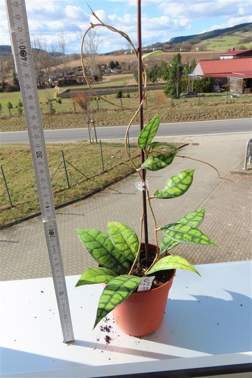 Die Hoya callistophylla Black Cat ist eine außergewöhnliche, epiphytisch wachsende Wachsblume, die sich durch ihre intensiv geäderten Blätter auszeichnet. Sie wird von Sammlern wegen ihrer beeindruckenden Blattzeichnung und der duftenden Blüten geschätzt.