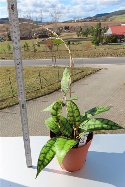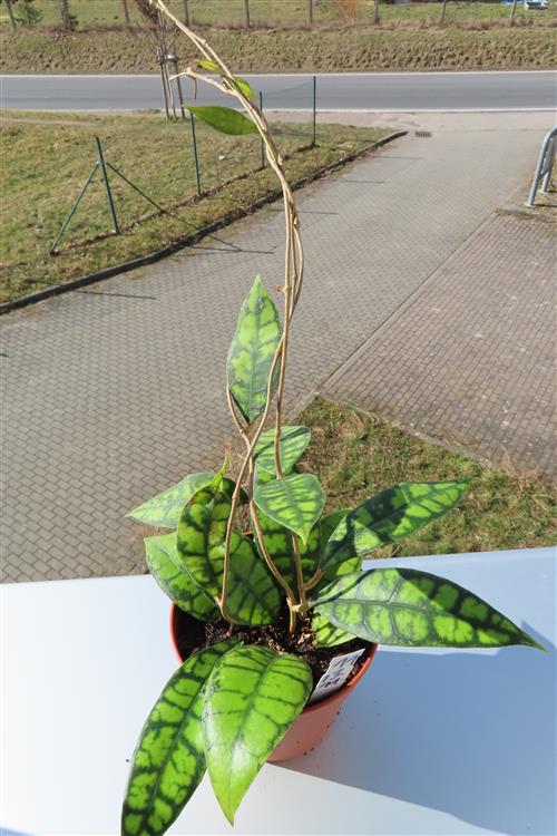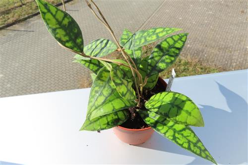 Die Hoya callistophylla Black Cat ist eine außergewöhnliche, epiphytisch wachsende Wachsblume, die sich durch ihre intensiv geäderten Blätter auszeichnet. Sie wird von Sammlern wegen ihrer beeindruckenden Blattzeichnung und der duftenden Blüten geschätzt.