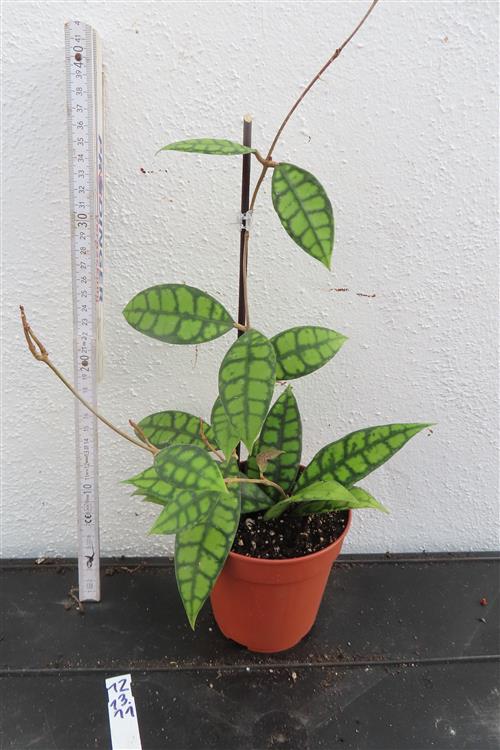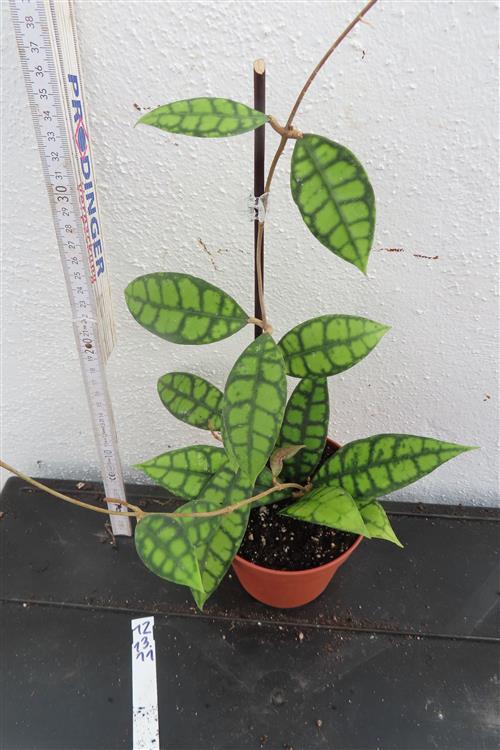 Die Hoya callistophylla Black Cat ist eine außergewöhnliche, epiphytisch wachsende Wachsblume, die sich durch ihre intensiv geäderten Blätter auszeichnet. Sie wird von Sammlern wegen ihrer beeindruckenden Blattzeichnung und der duftenden Blüten geschätzt.