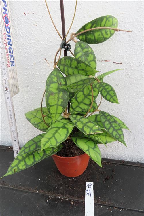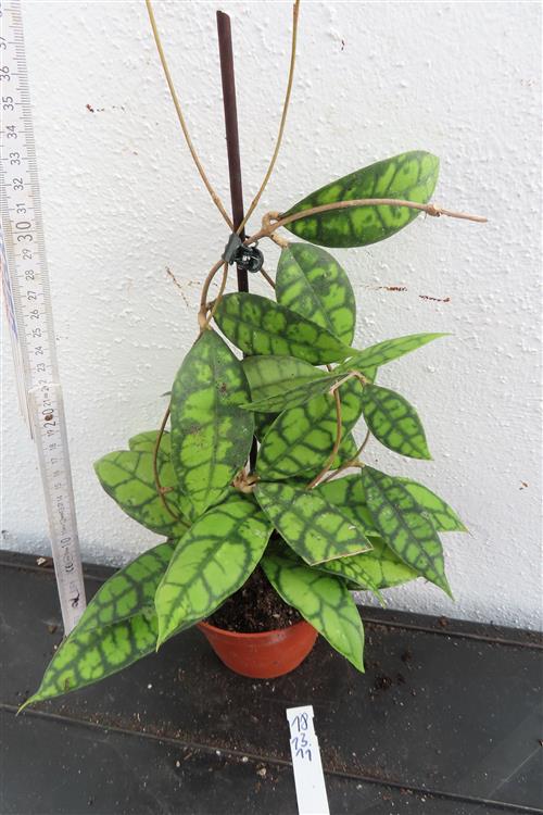 Die Hoya callistophylla Black Cat ist eine außergewöhnliche, epiphytisch wachsende Wachsblume, die sich durch ihre intensiv geäderten Blätter auszeichnet. Sie wird von Sammlern wegen ihrer beeindruckenden Blattzeichnung und der duftenden Blüten geschätzt.