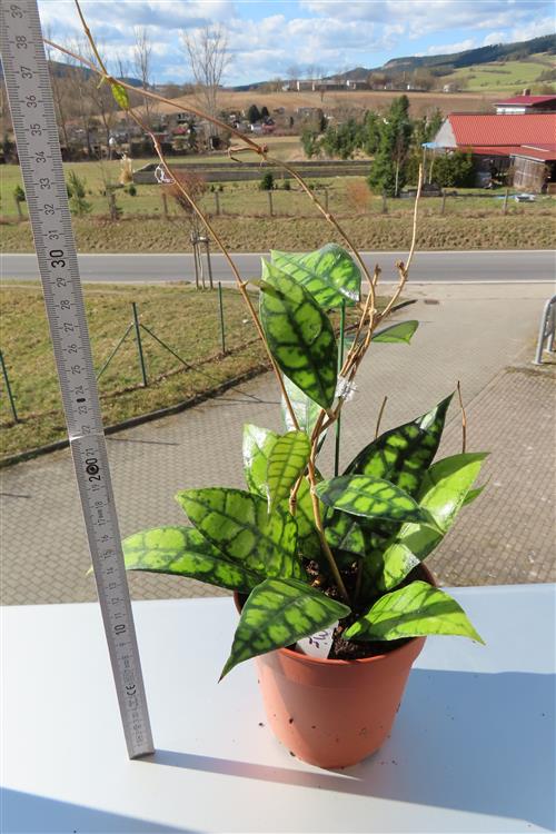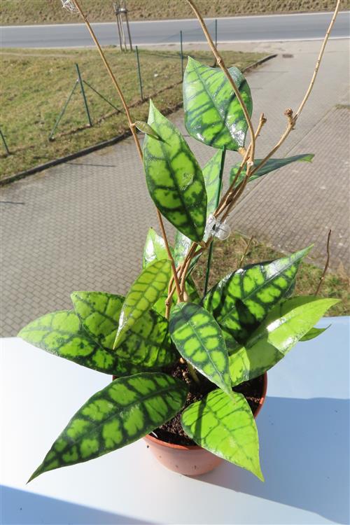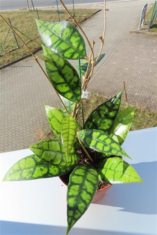 Die Hoya callistophylla Black Cat ist eine außergewöhnliche, epiphytisch wachsende Wachsblume, die sich durch ihre intensiv geäderten Blätter auszeichnet. Sie wird von Sammlern wegen ihrer beeindruckenden Blattzeichnung und der duftenden Blüten geschätzt.
