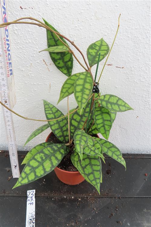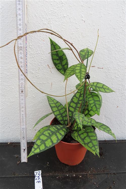 Die Hoya callistophylla Black Cat ist eine außergewöhnliche, epiphytisch wachsende Wachsblume, die sich durch ihre intensiv geäderten Blätter auszeichnet. Sie wird von Sammlern wegen ihrer beeindruckenden Blattzeichnung und der duftenden Blüten geschätzt.