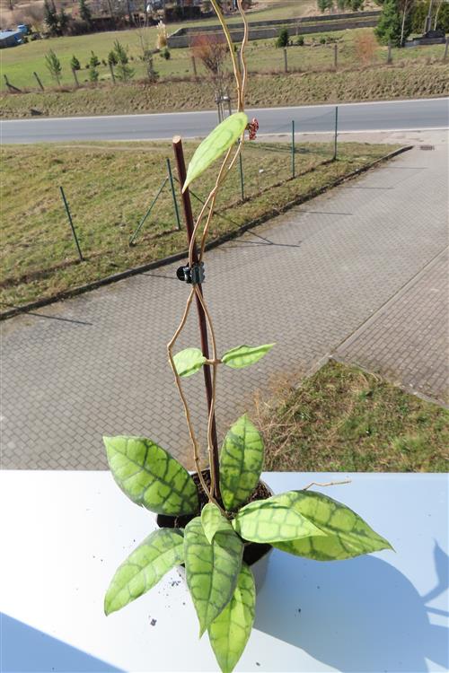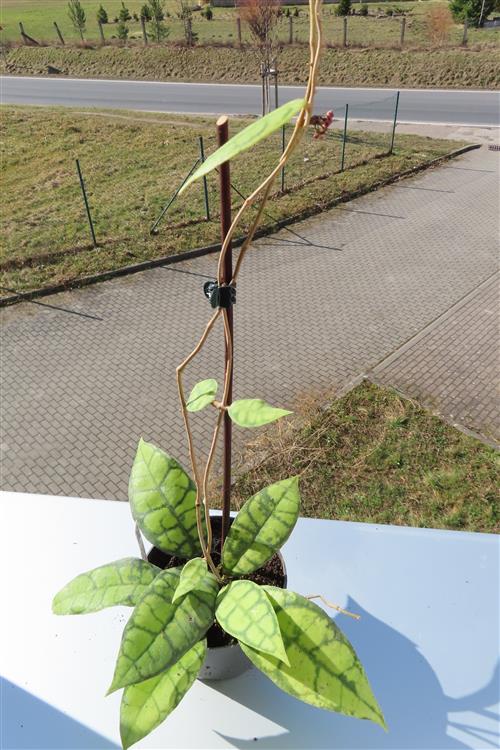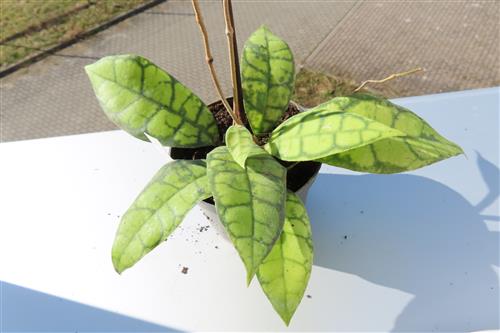 Die Hoya callistophylla Black Cat ist eine außergewöhnliche, epiphytisch wachsende Wachsblume, die sich durch ihre intensiv geäderten Blätter auszeichnet. Sie wird von Sammlern wegen ihrer beeindruckenden Blattzeichnung und der duftenden Blüten geschätzt.