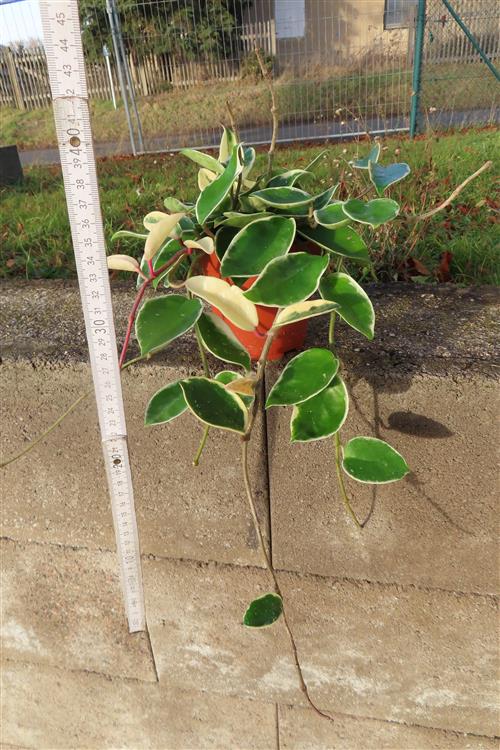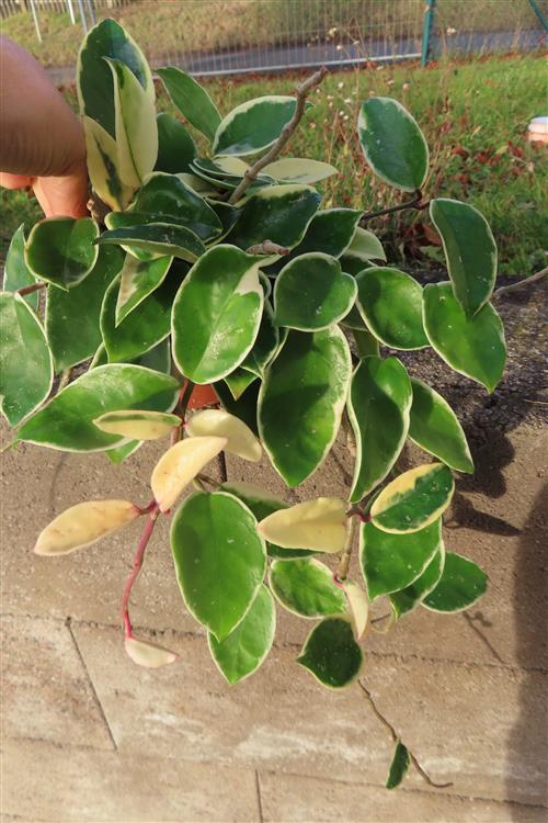 Die Hoya carnosa Krimson Queen variegata ist eine attraktive und pflegeleichte Sorte der Porzellanblume (Hoya carnosa), die für ihre panaschierten, wachsartigen Blätter bekannt ist. Sie eignet sich gut für Anfänger und kann sowohl klettern als auch hängend wachsen.