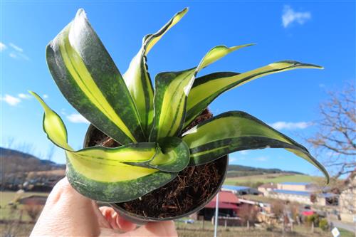 Die Sansevieria Curly Galaxy ist eine kompakte und pflegeleichte Bogenhanf-Sorte, die für ihre spiralförmig wachsenden Blätter bekannt ist. Die Blätter sind mittig gelb verlaufend mit grünen Rändern.