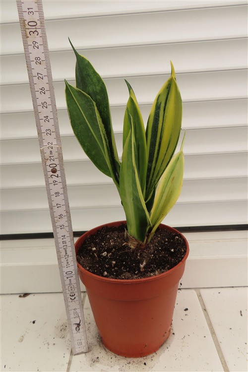 Die Sansevieria trifasciata Golden Flame, auch als Bogenhanf oder Schwiegermutterzunge bekannt, ist eine sehr pflegeleichte Zimmerpflanze mit attraktiven, goldgelb geflammten Blättern. Sie eignet sich hervorragend für Anfänger und verbessert das Raumklima.