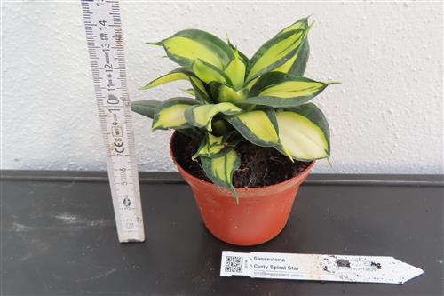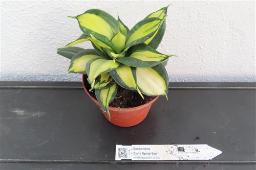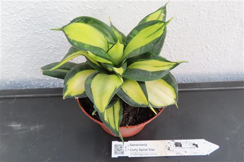 Die Sansevieria Curly Spiral Star ist eine kompakte und pflegeleichte Bogenhanf-Sorte, die für ihre spiralförmig wachsenden Blätter bekannt ist. Die Blätter sind meist dunkelgrün mit hellgrünen bis gelblichen Sprenkeln und Rändern.