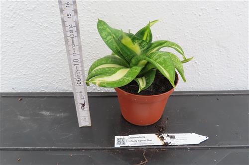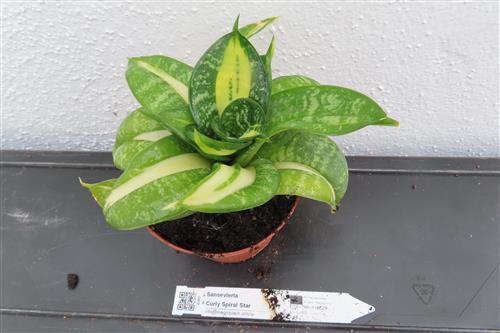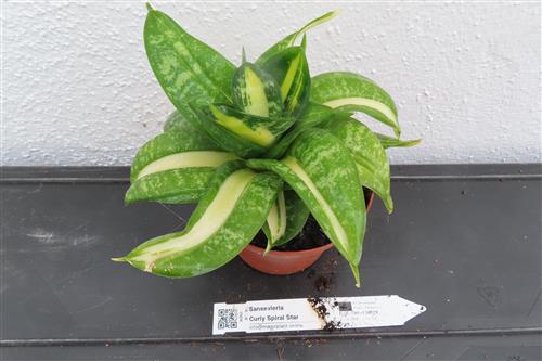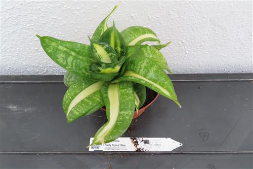 Die Sansevieria Curly Spiral Star ist eine kompakte und pflegeleichte Bogenhanf-Sorte, die für ihre spiralförmig wachsenden Blätter bekannt ist. Die Blätter sind meist dunkelgrün mit hellgrünen bis gelblichen Sprenkeln und Rändern.
