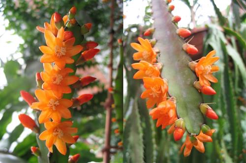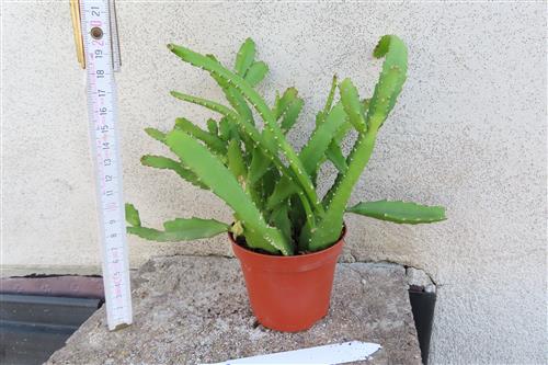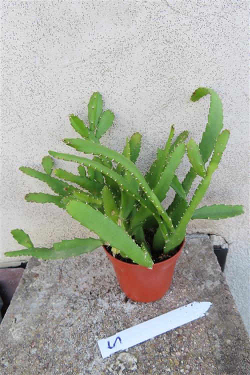 Lepismium monacanthum (auch bekannt als Pfeiffera monacantha oder Rhipsalis monacantha) ist ein epiphytischer Kaktus, der ursprünglich aus Bolivien und Argentinien stammt. Er ist bekannt für seine zweikantigen, abgeflachten Triebe, die bis zu 3 Meter lang werden können, sowie für seine leuchtend orangen Blüten und Beeren, die sich im Sommer bilden. Die Pflanze wächst in Tropenwäldern an Bäumen und benötigt daher ein warmes, feuchtes Klima sowie helles Licht ohne direkte Sonne.